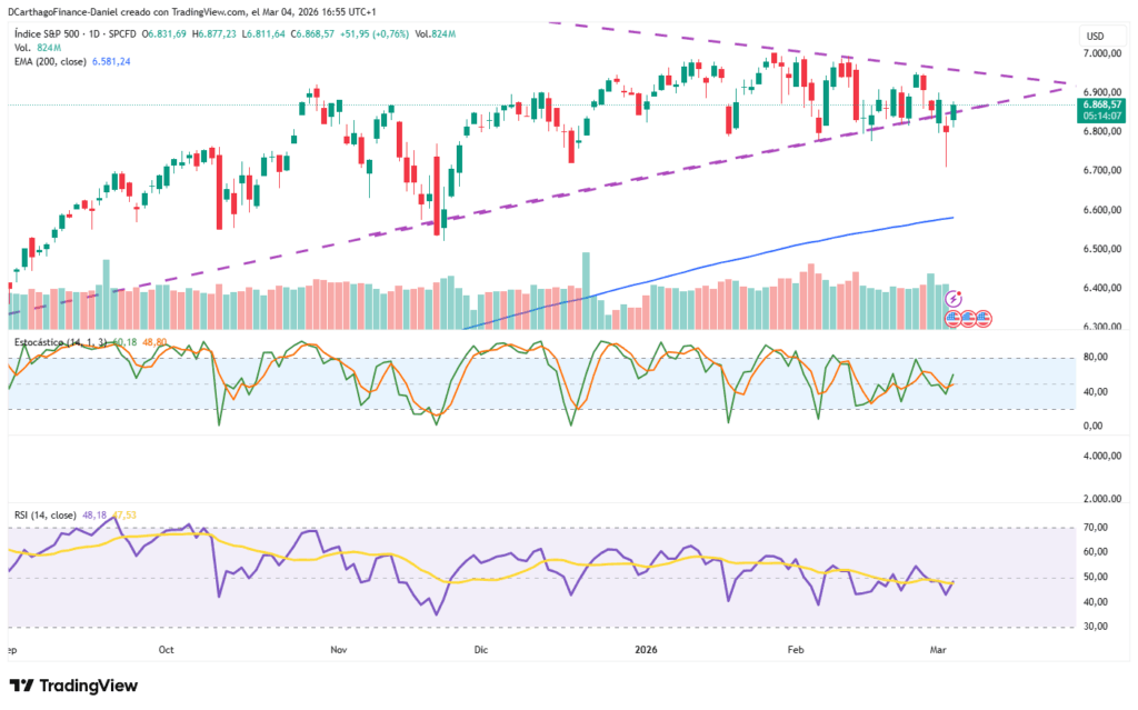 El SP500 lleva haciendo máximos decrecientes desde primeros de enero de este año. Los recientes ataques han acelerado las caídas, y los de arriba no están por la labor de dejarlo caer desde los 7000 y tener una mega crisis, por lo que van a subirlo a base de hostias.