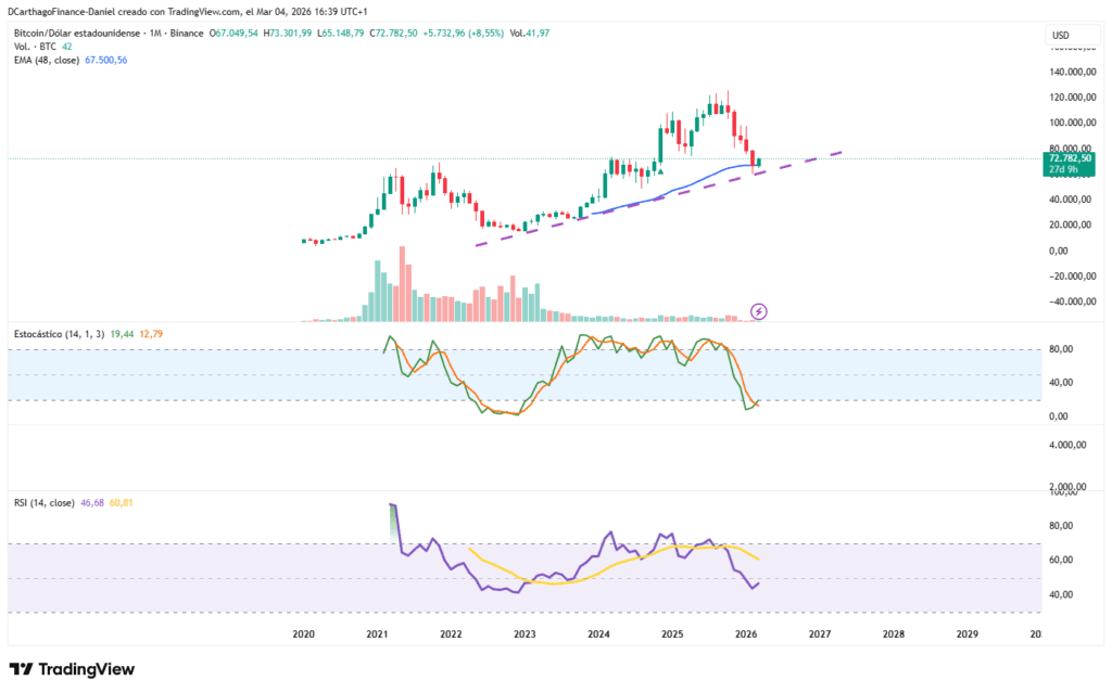 Algunos enemigos del activo dirán que como ha empezado la guerra contra Irán muchos están comprando ante la imposibilidad de transferir capitales, pero lo que está claro en el gráfico es que tocó el mínimo en Febrero y mantiene la media exponencial de 48 periodos. Sí es una media de dos años en velas mensuales. Los ataques comenzaron el 28 y el mínimo se produjo un 5 de febrero en 62.254$